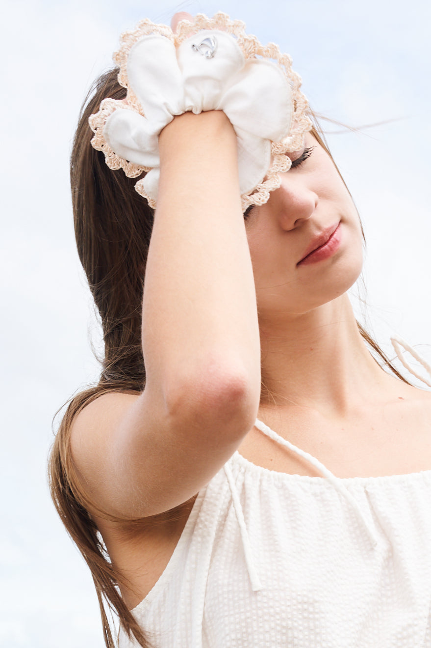 Delicate, dreamy, and handcrafted to perfection — the ELSA Scrunchie transforms a simple hair accessory into an expression of quiet luxury.