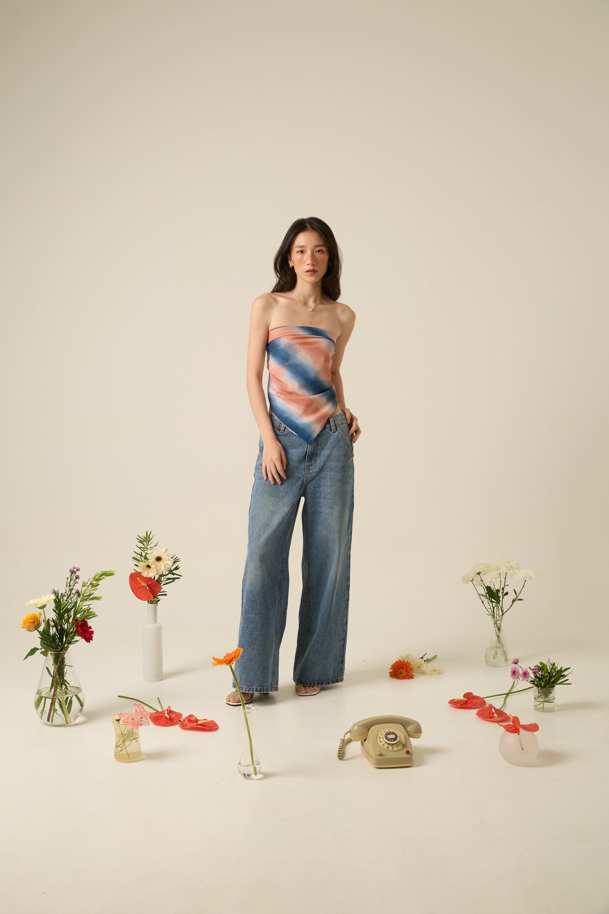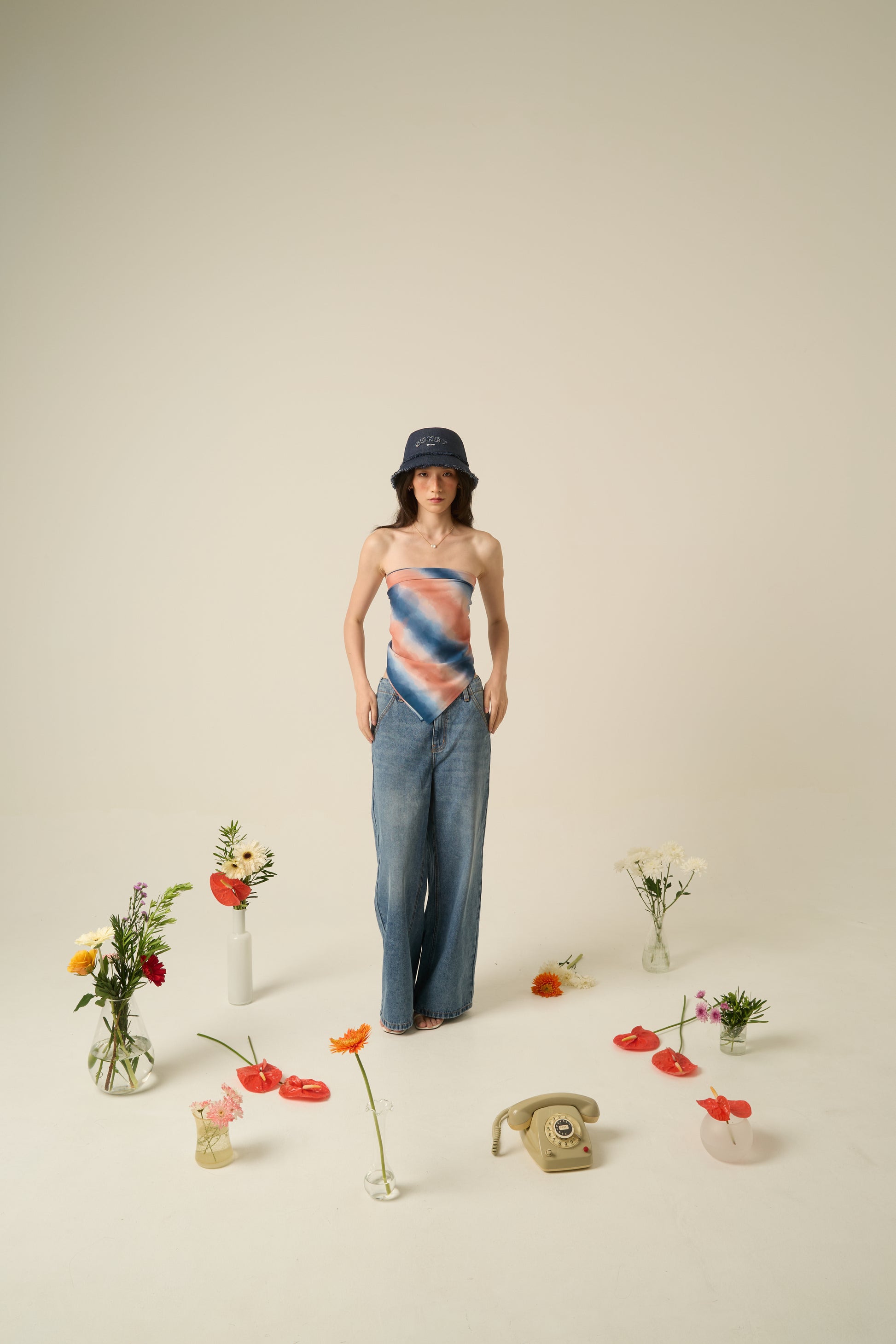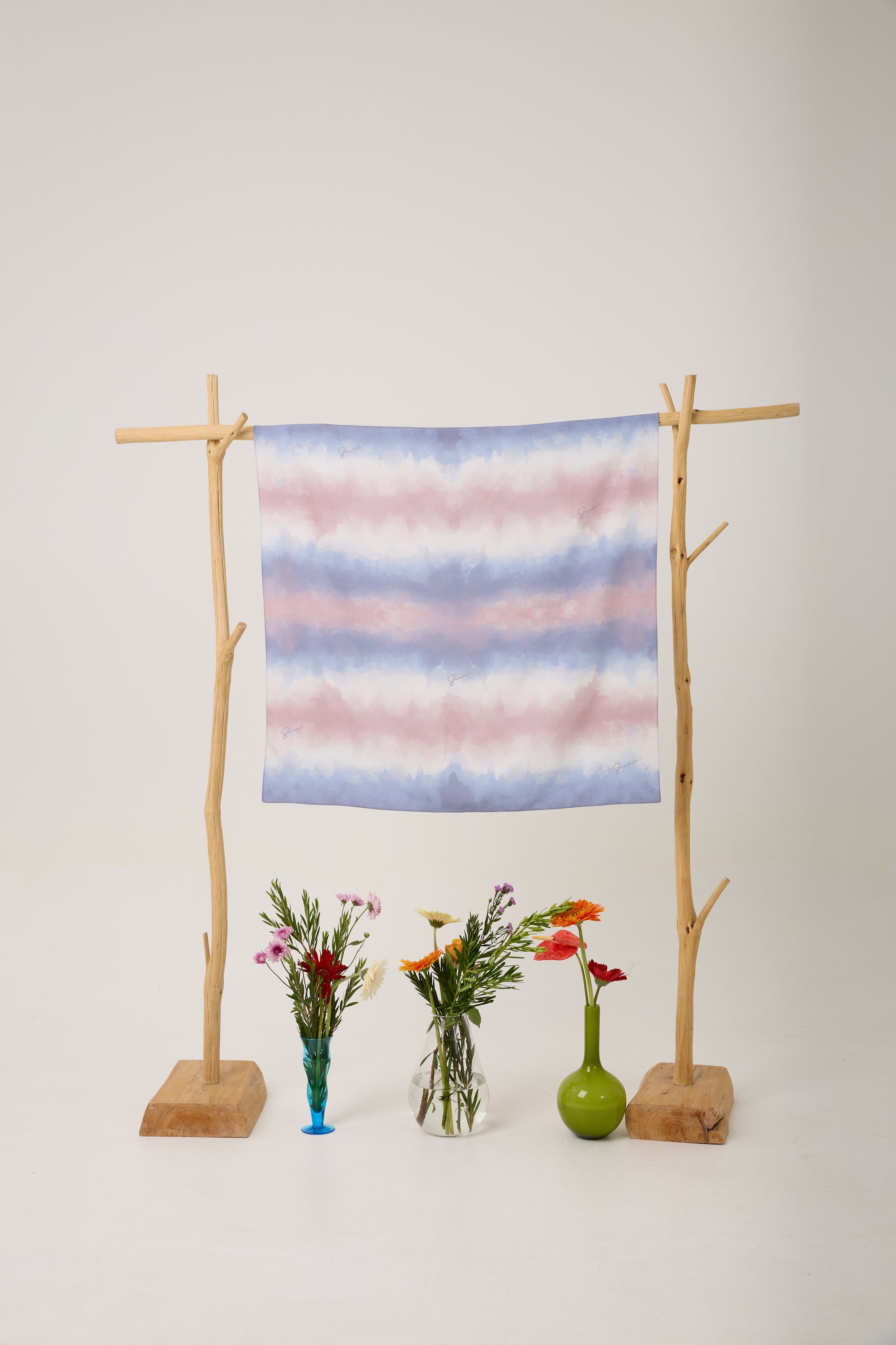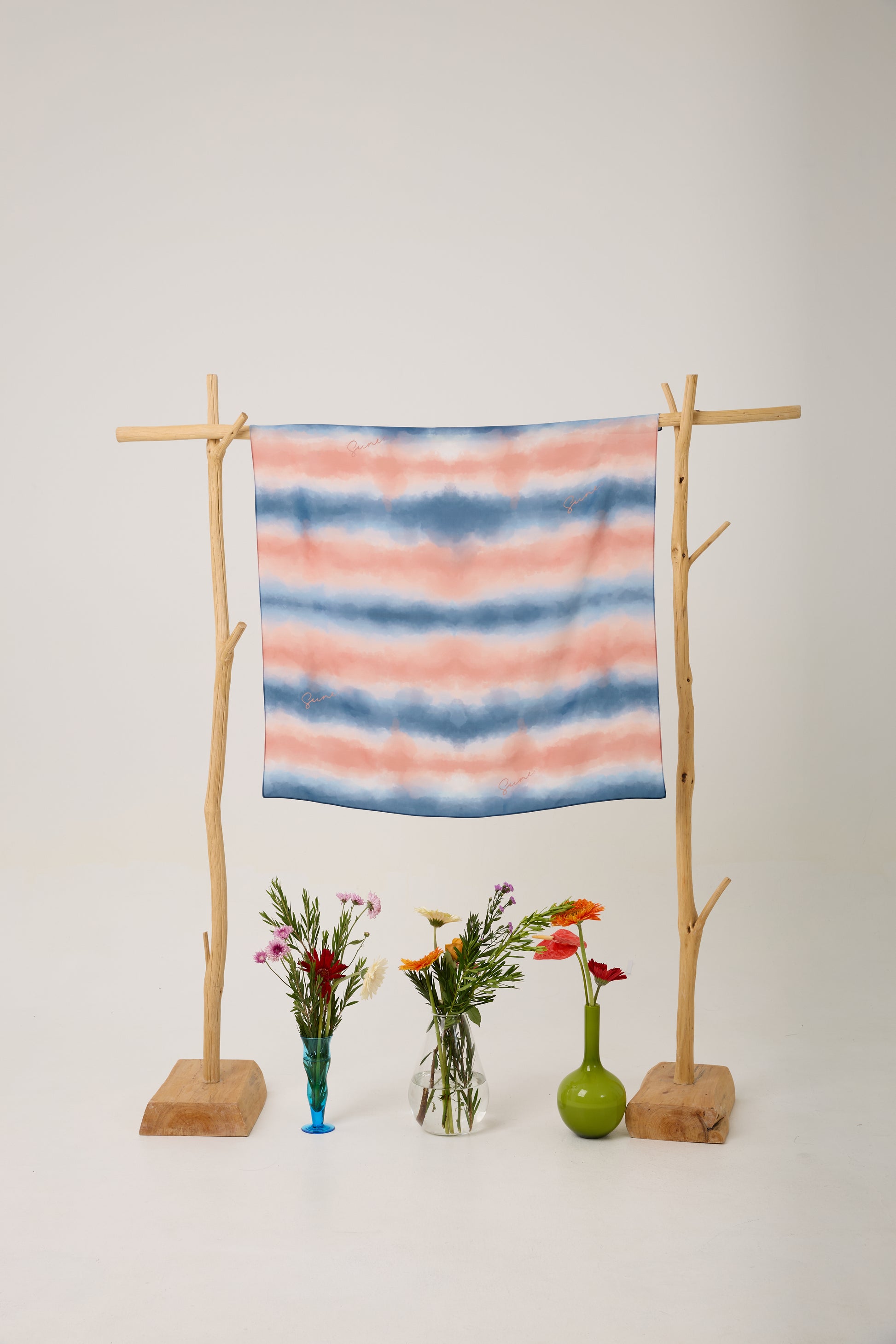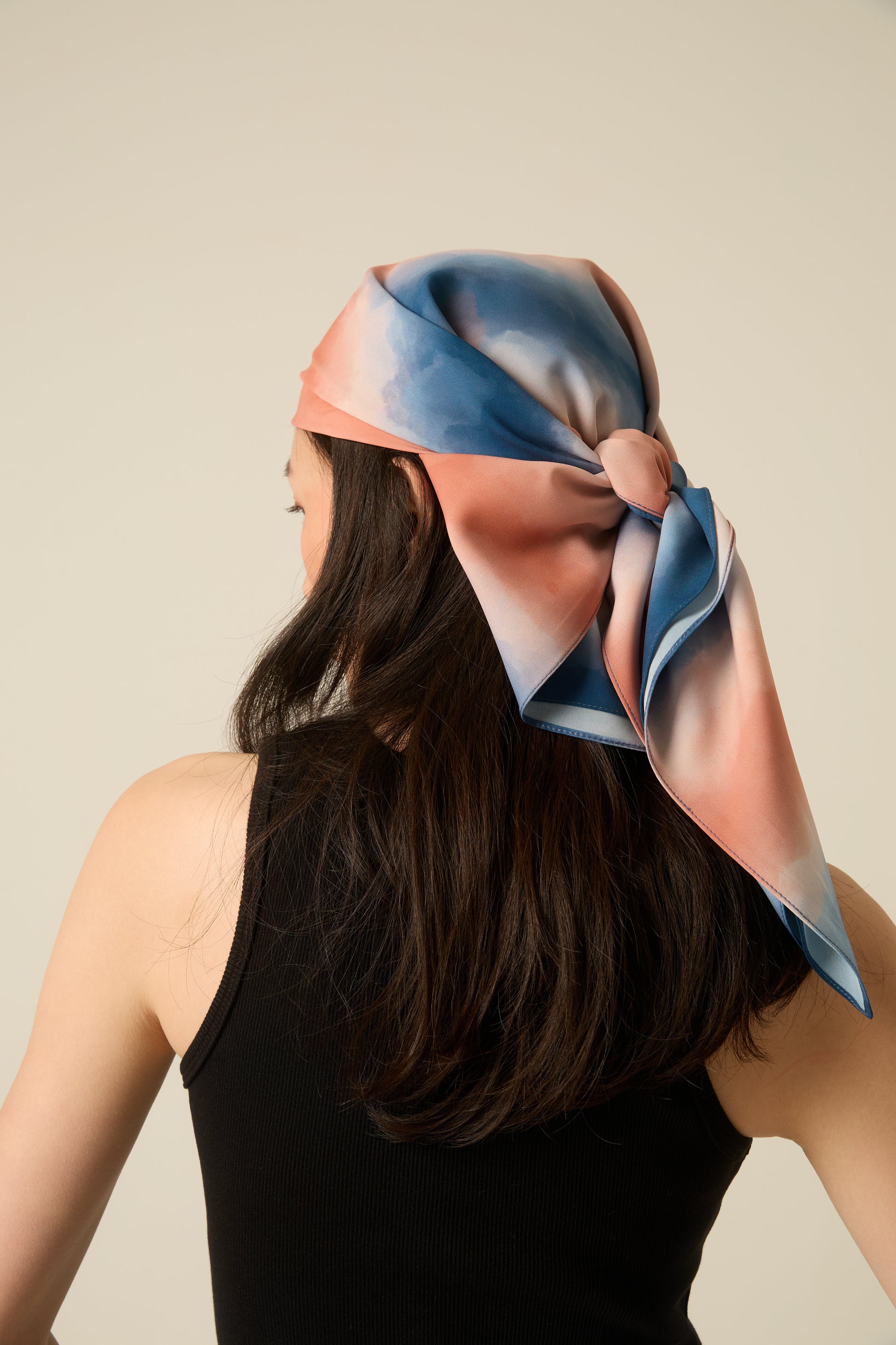 Crafted from premium matte satin, the KAREN Bandana showcases an elegant gradient print adorned with the signature SUNEV logo.