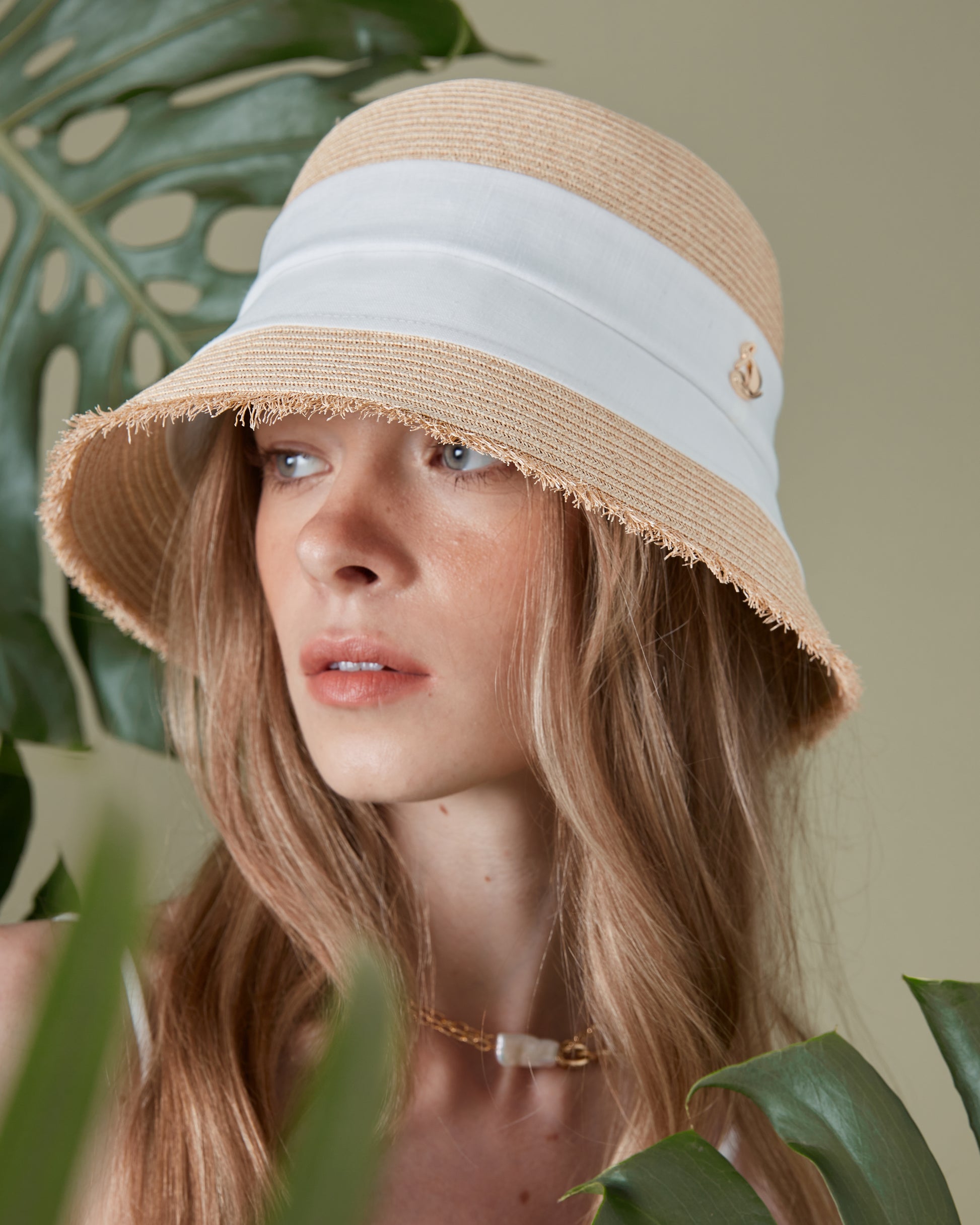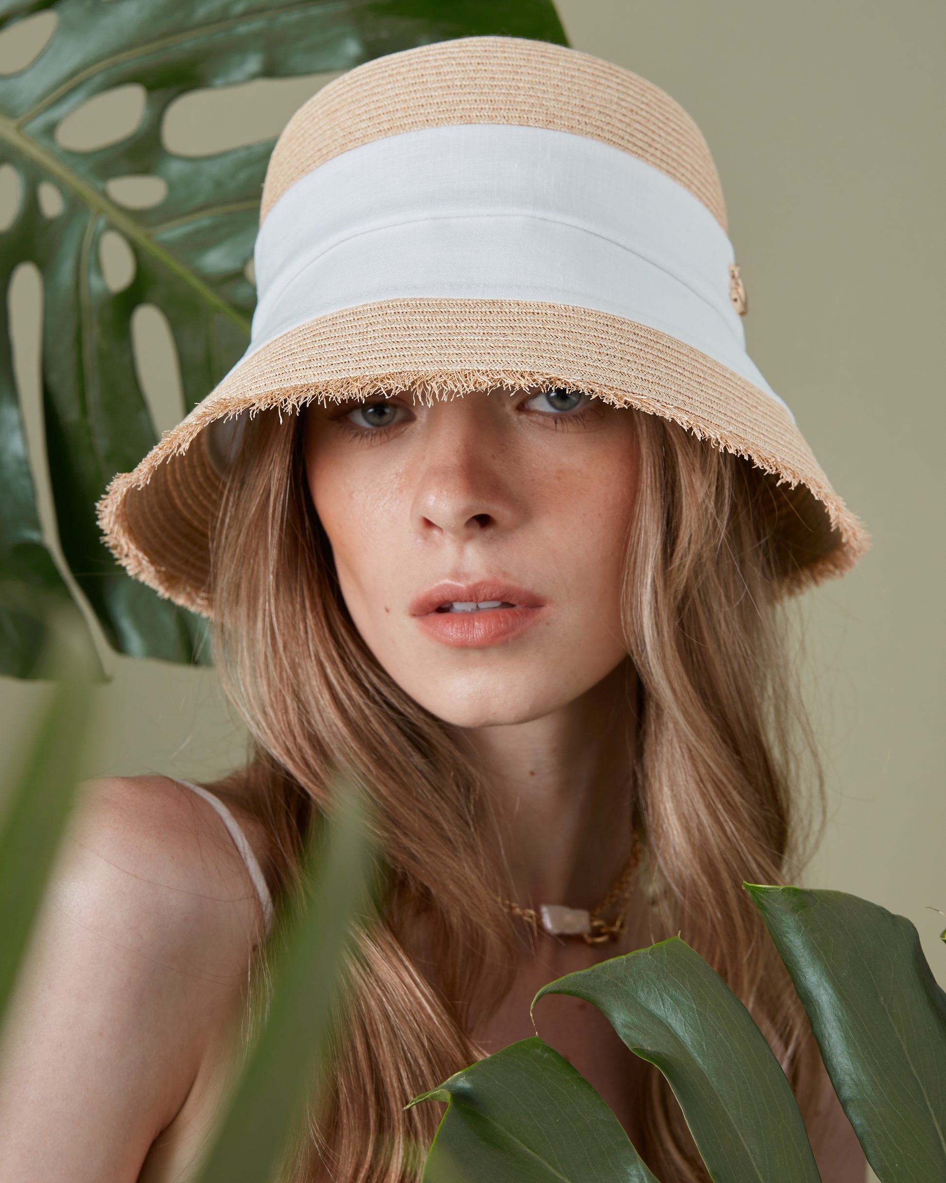 The minimalist silhouette is accented by a contrasting band that adds subtle dimension, while SUNEV’s signature hardware lends a touch of understated luxury. With a comfortable 57 cm head circumference and 8 cm brim, RAENI provides both style and sun protection in perfect balance.