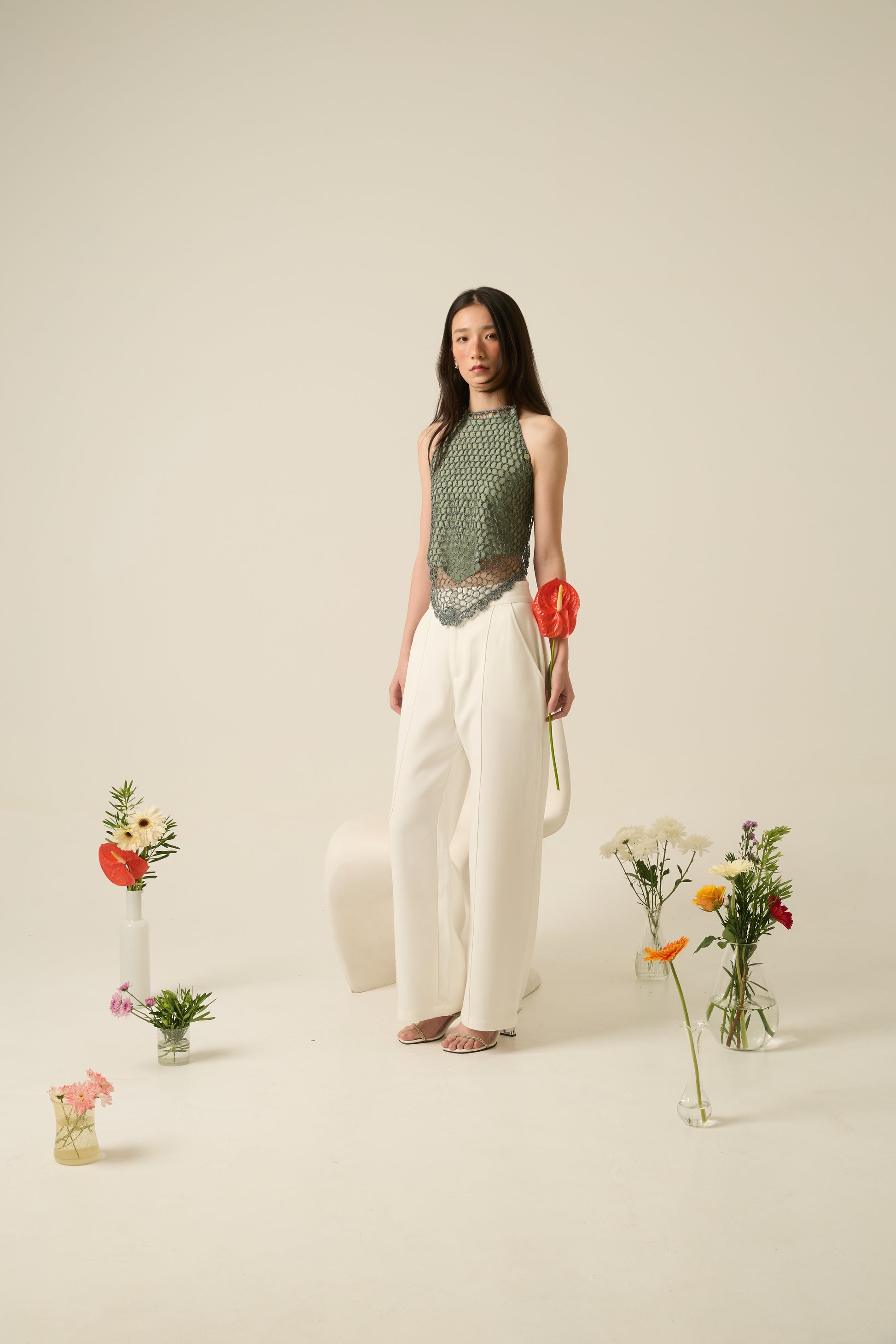 Delicately handcrafted, the VIOLA Crochet Halter Top embodies the essence of effortless elegance and artisanal detail. The upper crochet layer is intricately woven by hand from natural washable paper (Washi), giving it a lightweight, breathable texture with a refined structure.
